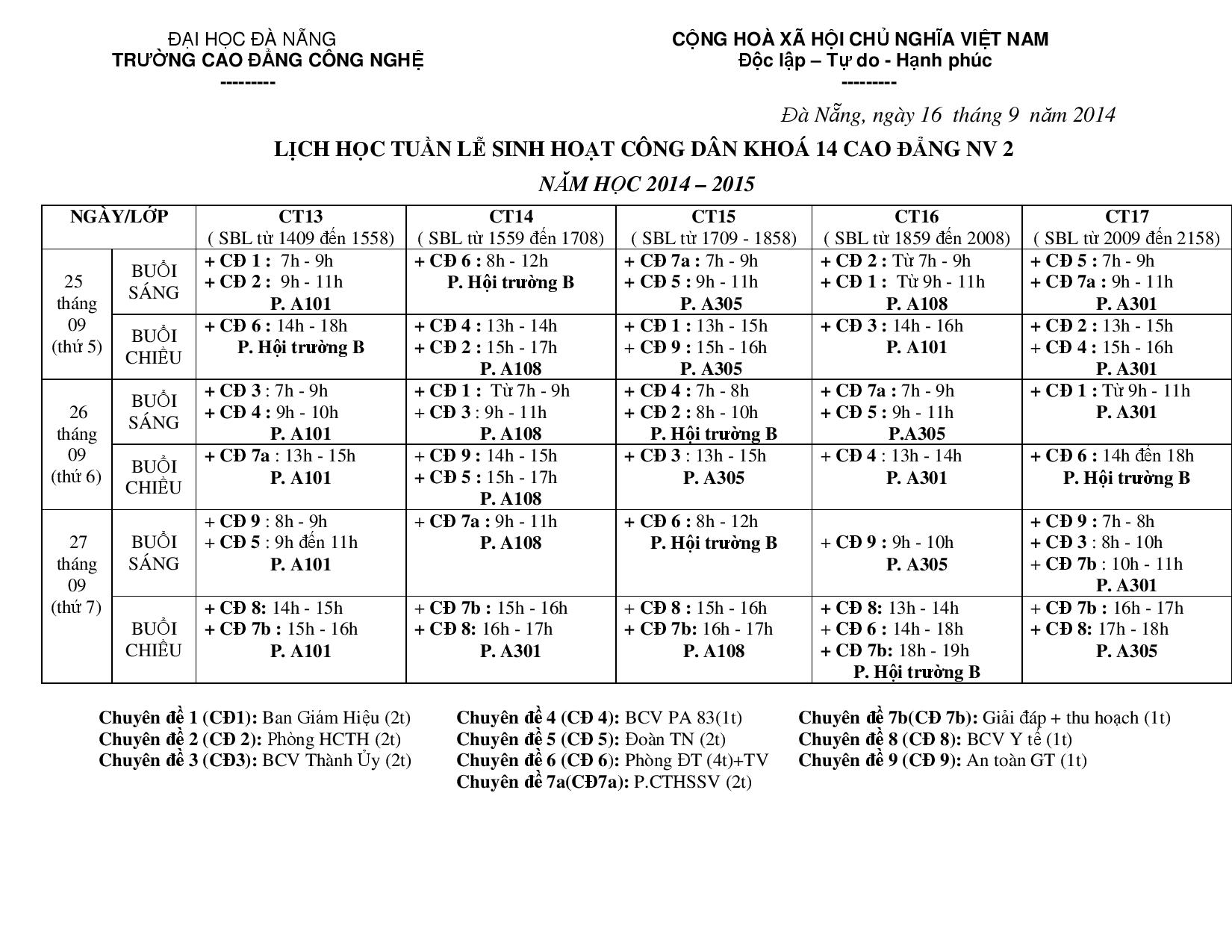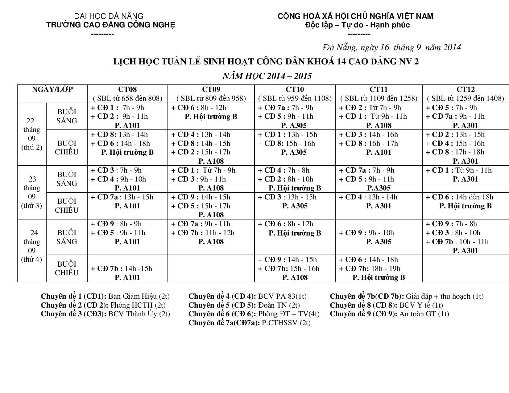 Thông báo dành cho tân sinh viên khóa 2014 - Cao đẳng - Nhập học NV2 | Sinh viên trúng tuyển NV2 đã nhập học xem danh sách xếp lớp Sinh hoạt công dân đầu khóa liên kết dưới đây để biết lớp được phân bổ (từ CT08 đến CT17). Sau đó xem lịch học của lớp CT tương ứng để đến dự đầy đủ các buổi báo cáo chuyên đề.