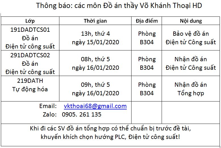 Đồ án Điện tử Công suất, Tổng hợp thầy Võ Khánh Thoại HD kì 191, 291 và 219 |  | Các em xem File và theo đúng lịch: + Bảo vệ ĐA ĐTCS 191; + Nhận ĐA ĐTCS 191 và ĐATH 219.