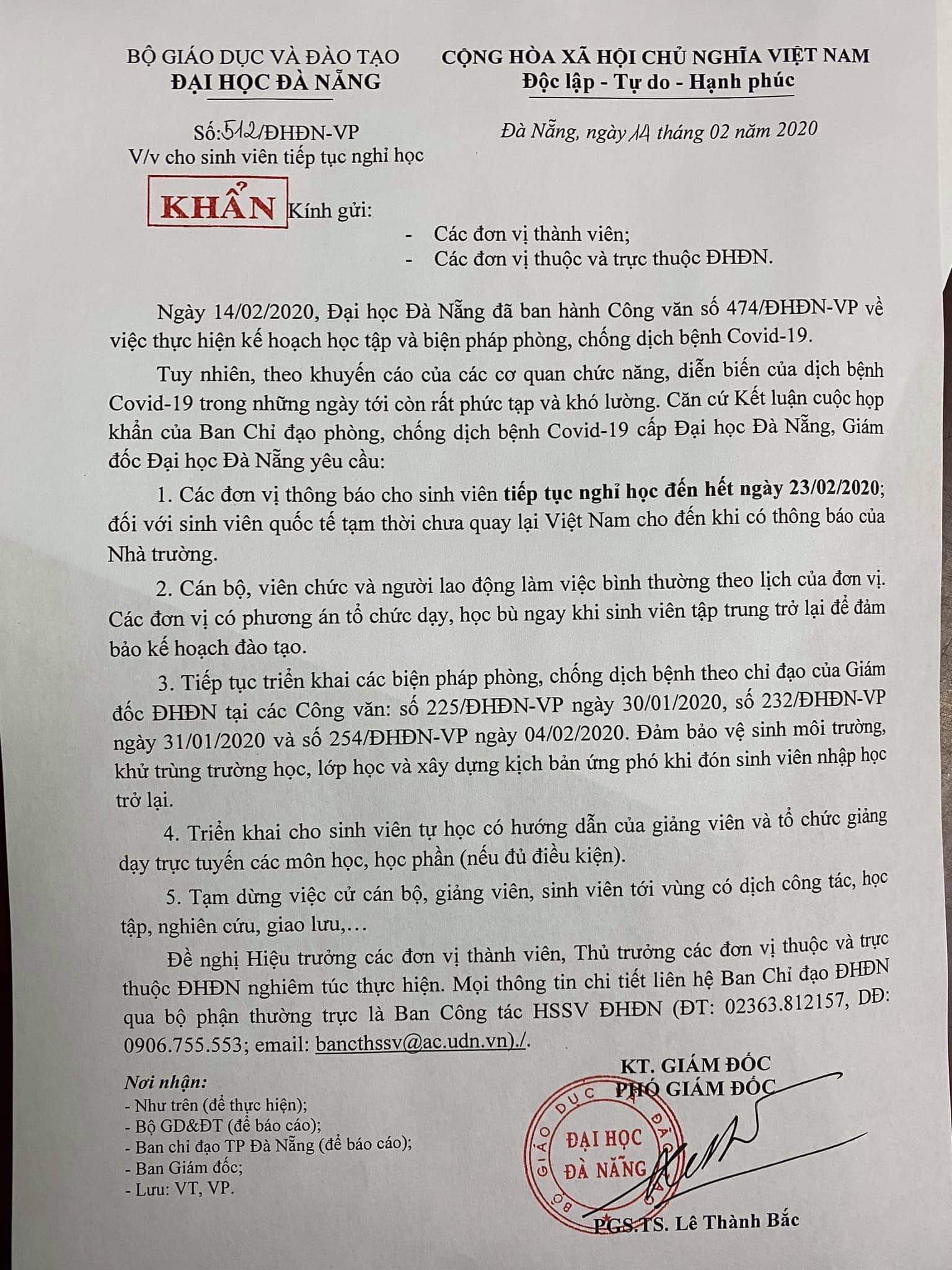Thông báo về việc cho sinh viên tiếp tục nghỉ học do dịch bệnh Covid-19 | Căn cứ công văn số 512/ĐHĐN-VP của Đại học Đà Nẵng ngày 14/02/2020 về việc cho sinh viên tiếp tục nghỉ học đến hết ngày 23/02/2020 do dịch bệnh viêm đường hô hấp; Trường Đại học Sư phạm Kỹ thuật thông báo cho sinh viên tiếp tục kéo dài thời gian nghỉ đến hết ngày 23/02/2020; Lịch thi của sinh viên Khóa 2019 tiếp tục được điều chỉnh lại sau một tuần(bắt đầu thi từ ngày 24/02/2020), lịch thi cụ thể sẽ được phòng Đào tạo cập nhật lại vào ngày 19/02/2020, đề nghị sinh viên và giảng viên có phụ trách các học phần thi theo dõi cập nhật lại lịch thi theo thông báo.