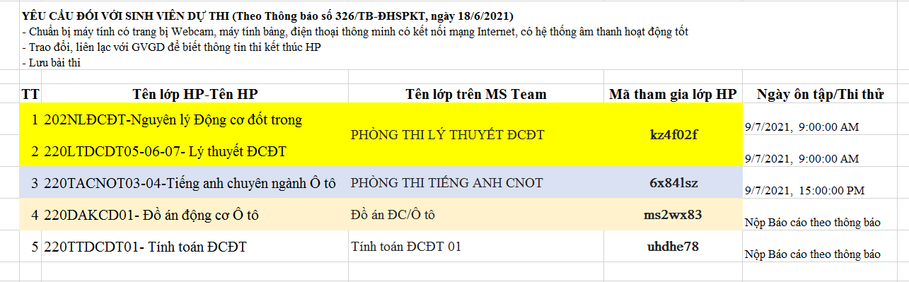 Thông báo thi TRỰC TUYẾN các lớp học phần (HP) do Thầy Nguyễn Minh Tiến phụ trách |  | Để đảm bảo cho việc tổ chức thi TRỰC TUYẾN, sinh viên các lớp HP do thầy Nguyễn Minh Tiến phụ trách cần CHÚ Ý: - Đăng nhập vào PHÒNG THI TRỰC TUYẾN trên MS TEAM trước 23:59:00 ngày 10/07/2021 (Xem hướng dẫn ở file đính kèm). - Tham gia thi thử tại PHÒNG THI TRỰC TUYẾN vào ngày 09/07/2021. - Chuẩn bị phương tiện dự thi theo TB 326-ĐHSPKT * Nếu có vấn đề về tài khoản Outlook thì liên hệ phòng CTSV để xử lý. * Các vấn đề liên quan HP liên hệ tại PHÒNG THI hoặc qua email: nmtien@ute.udn.vn |